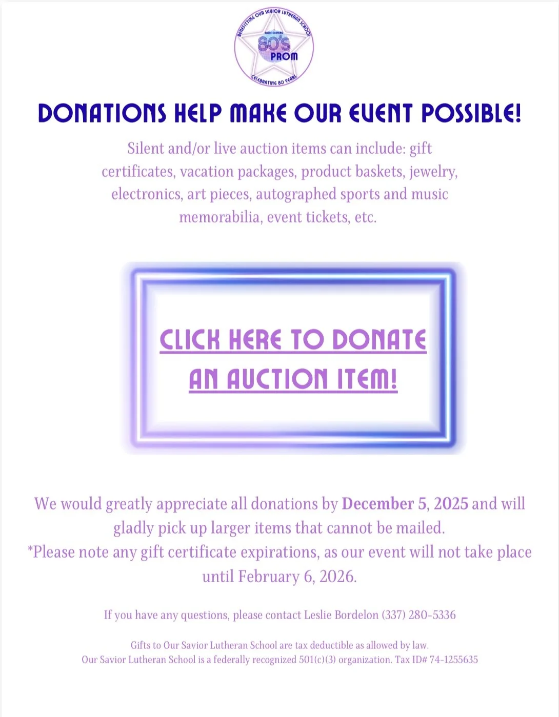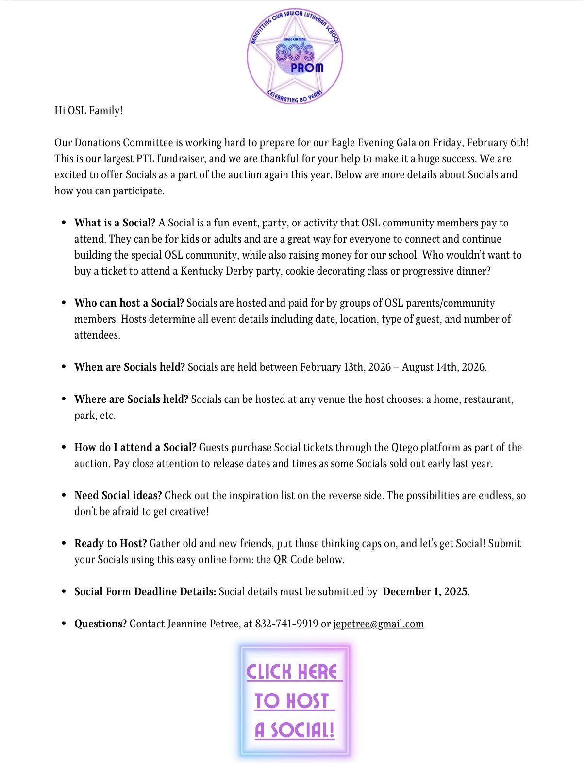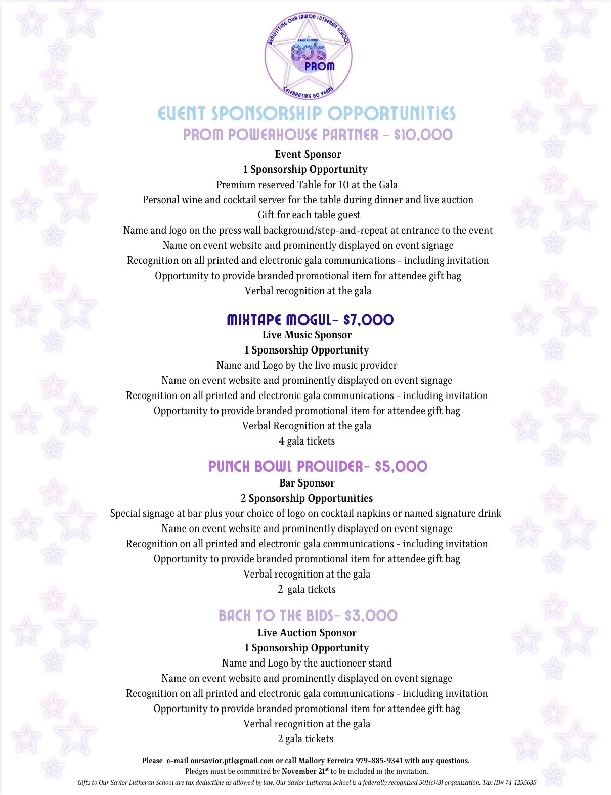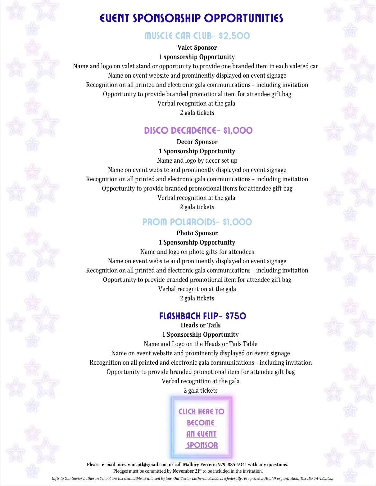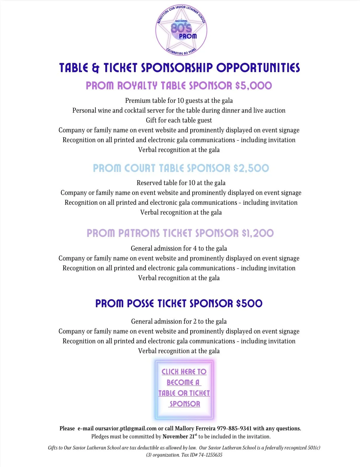 Letter From PTL President Donating An Auction Item Info Table & Ticket Sponsor Opportunities Info Event Sponsorship Opportunities Info Event Sponsorship Opportunities Info Cont’ Hosting Socials Info Social Ideas Info